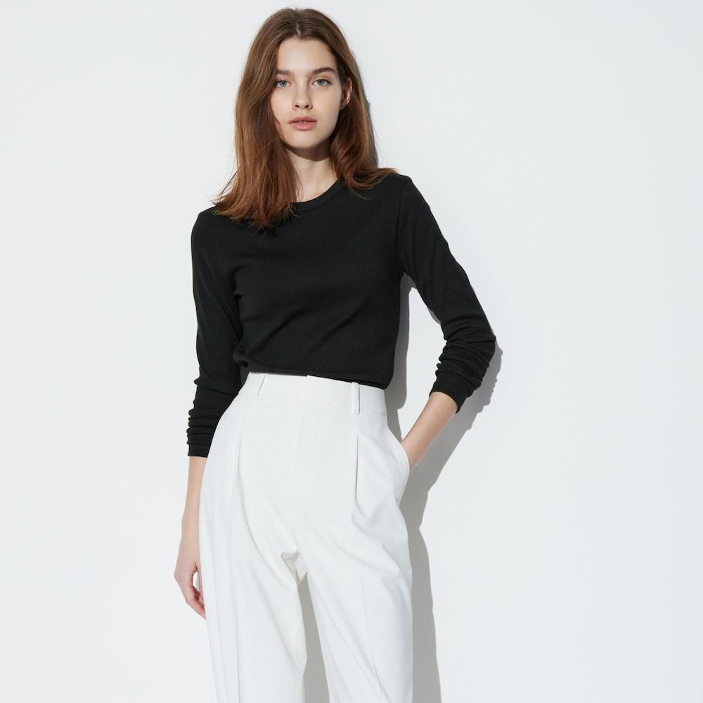 تي شيرت نسائي ناعم مضلع برقبة دائرية من Uniqlo (أكمام طويلة 2024 ربيع جديد) 465751